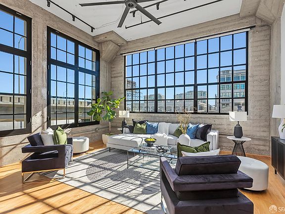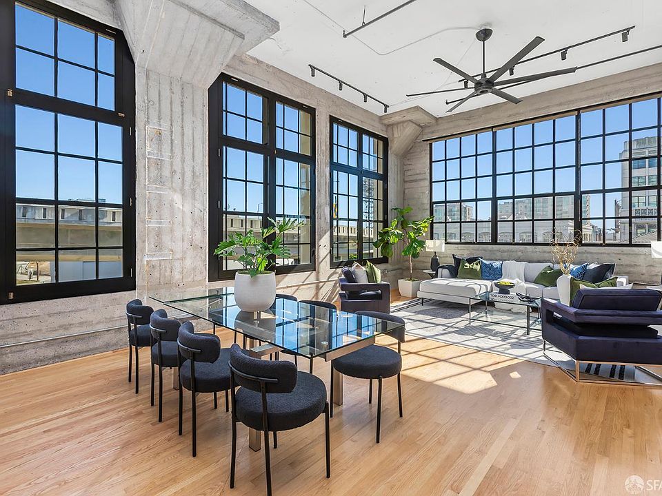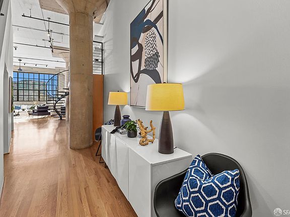 The Clocktower Lofts. Housed in the iconic 1907 Schmidt Lithograph Building, the Clocktower Lofts feature 127 unique live/work residences that celebrate industrial character, expansive space, and interiors crafted for both work and life. Converted by David Baker & Associates in the 1990s, the lofts blend heritage with modernity, featuring brick, timber, and concrete finishes, landscaped courtyards, and elevator access.Each loft tells its own story, and no two are alike. Unit #461T This commanding 4th-floor corner loft is defined by impressive scale, abundant light, and generous square footage. Original features include: heavy timber beams, concrete mushroom columns, and gridded steel-and-glass windows. The open floor plan flows between living, dining, and work areas. Renovated kitchen and bathrooms, custom maple cabinetry, a black steel spiral staircase to a mezzanine, full-size washer/dryer, ample storage, and secure garage parking complete the home. The South Beach neighborhood: blends history and contemporary life: converted warehouses sit alongside glass towers; tech offices and creative studios share streets with restaurants, cafs, and some of the city's finest watering holes within walking distance of the waterfront, Embarcadero, Oracle Park, and downtown.