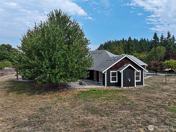 Gorgeous 3200+ sq. ft. single story 3 bed/3 bath home sits at the end of a private road. 5 flat acres with 1.5 ac. of timber, a 36 x 48 shop, green house, chicken coup & garden. Exterior recently painted & stained. Stunning rock work throughout the interior & exterior. Large living room w/gas fireplace, vaulted ceilings, double French doors opening to a large patio, wildlife & a covered hot tub. Kitchen has tile counters & floors, lg. pantry, stainless appliances & plenty of space to work. Second living room area opens up to a dining room giving plenty of room to entertain. Large primary bedroom w/walk in closet, 5 piece bath, sitting area & a door to that beautiful patio. Room above garage would make a great game room, gym or office.