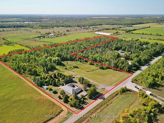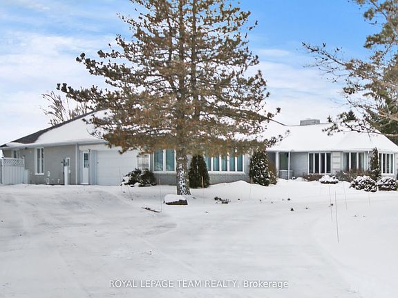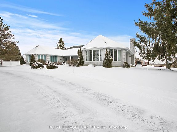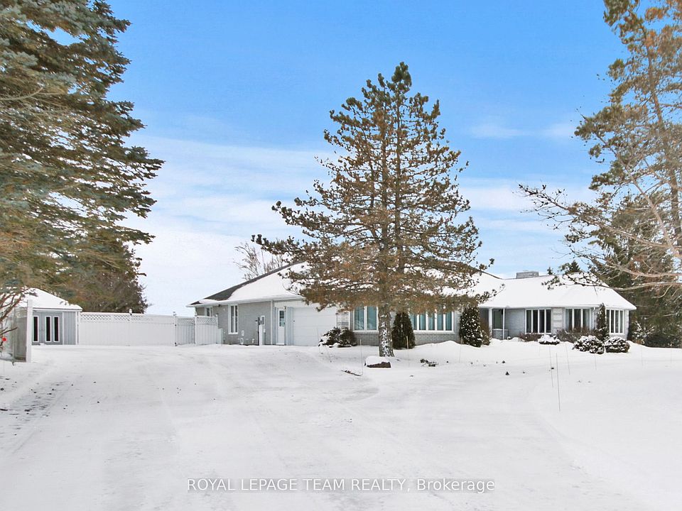 Nestled on more than 18 acres of serene woodland, this expansive brick bungalow offers far more than a residence-it delivers a refined country lifestyle. A stately circular drive & covered porch, accented by graceful hip rooflines, set the tone for classic style. Inside, the welcoming foyer flows into a bright open-concept design. The gourmet kitchen features warm wood cabinetry, granite counters, a large island w/extended breakfast bar, & built-in stainless appliances; wall oven, gas cooktop, and a dedicated barista station. A sun-filled window above the sink captures calming rural views. Tile continues through the kitchen, while hardwood with custom inlay defines the oversized great room, complete with built-ins and an inviting FPL. Garden doors from both the great room & dining area lead to a stunning sunroom bathed in light, opening onto a generous deck for effortless indoor-outdoor living. A spa-style hot tub retreat showcases sweeping views of nature. The main floor hosts 2 spacious bedrms, led by an elegant primary suite w/WIC, fireplace, spa-inspired ensuite w/double vanity & custom shower, and private deck access. A second 4-pce bath, laundry, and wide corridors complete the level. Downstairs, the fully finished lower level offers exceptional flexibility with a recreation and games room + FLP, fitness area, wet bar, home theatre, den/bed, cold storage, 3-pce bath, & hobby room. The opposite wing features 2 self-contained one-bed in-law suites, each with living rm, kitchen, 4-pce bath, private side entrance, shared foyer, & laundry-ideal for multigenerational living, guests, or rental potential. Outdoor amenities include 2 decks, a spacious covered porch, and a 3-car garage w/interior access to both levels. Added value: 2023 whole-home generator, geothermal heating & cooling, fibre internet, & 4 fireplaces. The forested acreage inspires endless opportunities - trails, snowshoeing or skiing, equestrian centre, or creating a hobby farm in Ashton, min to Hwy 7.