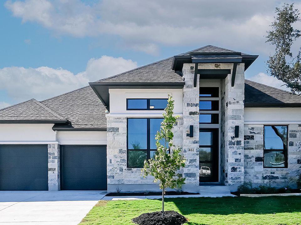 Step off the front porch into the extended entryway with a 12-foot rotunda ceiling. Hardwood floors throughout living areas. Off of the main hallway are two secondary bedrooms which offer full bathrooms and walk-in closets. Adjacent is a private guest suite featuring a full bathroom, walk-in closet and linen closet. As you enter into the vast family room you are greeted by a fireplace and sliding glass door. French doors open into the game room which is located off of the dining area. The kitchen hosts an island with built-in seating, ample counterspace, 5-burner gas cooktop and a walk-in pantry. The primary bedroom offers three large windows. The primary bathroom hosts dual vanities, a freestanding tub, large glass enclosed shower, and two walk-in closets. Covered backyard patio. The mud room and utility closet are off of the three-car garage. Representative Images. Features and specifications may vary by community.