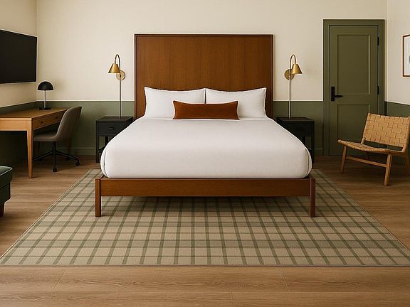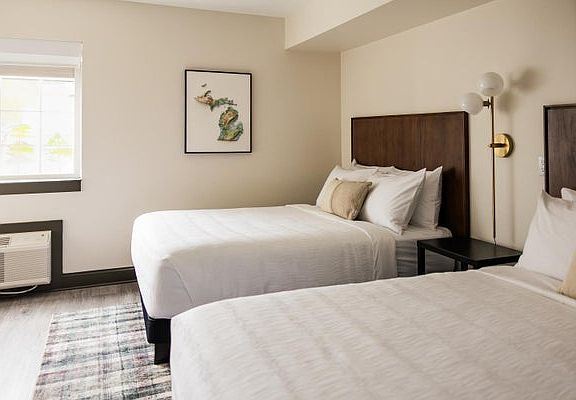 Studios at the Vic: King Bed Room, November to May Off Season Monthly Studio room rentals. Experience The Vic, where modern comfort meets rustic charm just steps from Grand Traverse Bay and minutes from NMC, downtown's shops, restaurants, and breweries. Our beautifully renovated building offers thoughtfully designed rooms, one complimentary parking space per unit, a fitness center, community room, and a laundry room. 24/7 guest support by text, on-site and virtual Front Desk services. Single King and Double Queen rooms available. In room microwave and mini-fridge, with available hot plate. Clean towels and sheets weekly with light cleaning included in Utility fee.