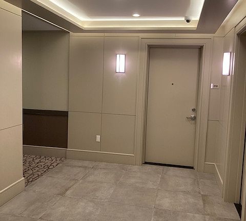 Covered parkingCenter island in kitchenSecured elevator buildingStainless steel appliancesLaminate floorsCustom blinds