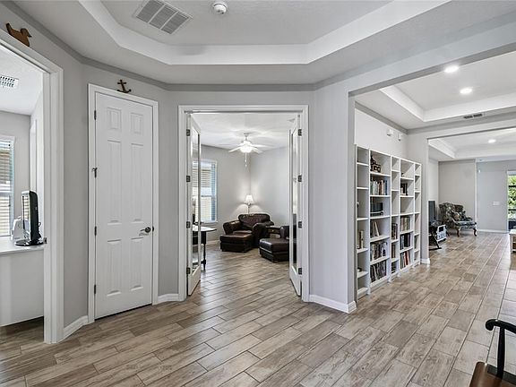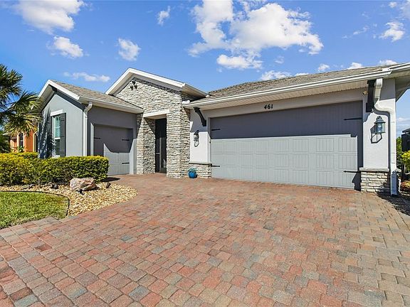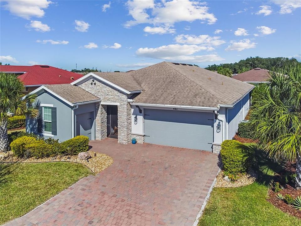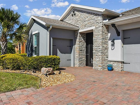 Beautiful Cambria model featuring 3 bedrooms, 2.5 baths, and a GOLF CART GARAGE with a mini-split HVAC system, located in the highly desirable Treviso neighborhood of Solivita. The stone façade adds timeless curb appeal and complements the WIDENED DRIVEWAY. This stunning home welcomes you with TRAY CEILINGS, a leaded-glass front door, and an OPEN-CONCEPT floor plan leading into the gourmet kitchen. Wood-look PLANK TILE flooring flows throughout, complemented by neutral wall tones. The kitchen features 42" cabinets with LOWER PULL-OUT shelves, a travertine stone backsplash, QUARTZ countertops, a closet pantry, and a breakfast bar. The spacious PRIMARY SUITE offers incredible storage with TWO WALK-IN closets featuring custom built-ins and TWO additional linen closets. The ENSUITE BATH includes a TILED WALK-IN shower with BENCH seating, raised vanities, and DUAL SINKS. A conveniently located HALF BATH includes a LINEN closet for added storage. At the front of the home, a junior GUEST SUITE includes its own private bath, ideal for visiting guests. The third bedroom, with double FRENCH GLASS DOORS, can easily serve as a hobby room or media room. The garage features EPOXY FLOOORING, pull-down attic stairs, and an overhead storage rack. The DROP ZONE entry from the garage adds convenience with custom cabinetry and counter space. The laundry room includes a UTILITY SINK, upper and lower cabinetry, and the WASHER and DRYER are included in the sale. The EXTERIOR of the home was FRESHLY PAINTED in FALL of 2024. Enjoy peaceful mornings or relaxing evenings on the EAST-facing COVERED and SCREENED lanai overlooking the FENCED yard, where the addition of TREES enhances privacy and complements the natural setting. The yard also features a puppy picket addition for the safety of small pets. The HOA: - maintains the LANDSCAPING & IRRIGATION systems in the common areas as well as at individual homesites - maintains the roads throughout the community - PROVIDES SECURITY with gate guards and mobile patrols including the Polk County Sheriff - allows AUTOMATED GATE ACCESS for residents via license plate readers - provides residents with Fiber Optic Internet & TV service.***Poinciana Lakes Plaza is a MAJOR NEW SHOPPING CENTER that opened directly across from the Solivita Main Gate in Summer of 2024. It features Sprouts Grocery, TJ MAXX, Ross, Burlington, Rack Room Shoes, 5 Below, Ulta, Outback, First Watch, 5 Guys, Urgent Care, Dentist, TD Bank, Petco & Hair Cuttery PLUS MORE TO COME.***