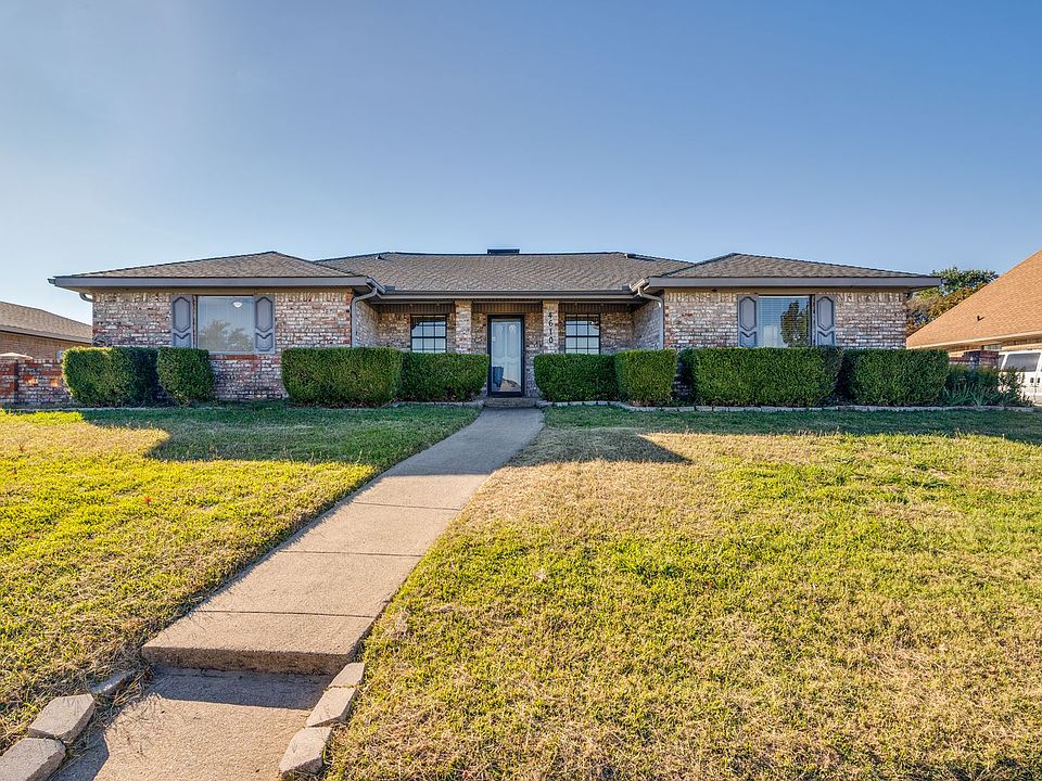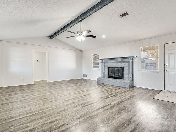 Come check this awesome 1-story house out before it's gone! Upon entering, you're greeted with nice engineered faux hardwood flooring, vaulted ceiling, and grey brick fireplace which complements the living area. Kitchen is to the right with STAINLESS STEEL APPLIANCES including refrigerator, dishwasher/disposal, and a kitchen island. Dining area off to the side with room for extra seating. All bedrooms are found on left side with double vanity sinks in all bathrooms (master bathroom has walk-in shower & closet). Backyard is fenced-in with awning covering the patio. 2-car garage with 2 covered spaces as well.