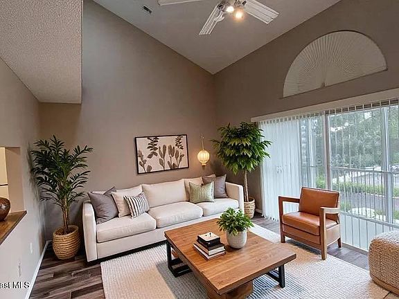 Perfect Location for easy access to I-95 , shopping, parks, downtown Melbourne & a short drive to area beautiful beaches. Welcome home to this ''move in ready condo'' (end unit) on 2nd level. Featuring an open plan design with family room, dining area, and newly updated kitchen with designer coastal color cabinets, granite countertops, tile backsplash, and a pass through / bar area. Main bedroom just off dining room with private bathroom and walk in closet. Wood look Tile plank flooring throughout. A quaint screened in front balcony has views of lake and faces community clubhouse / pool / tennis courts area. Access to laundry space is just off the balcony. Spacious Loft area can be used as 2nd bedroom, office or Flex space. Full bathroom just off the loft. Other features include: ceiling fans, window coverings, sky-lights, decorative mirror in dining area & storm door at entry. HOA includes: water, cable, i-net, roof, exterior paint. New A/C 2024 & breaker box with surge protector .