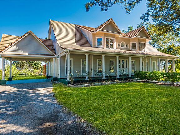 About 6 acres can have an agricultural exemption for bees, helping keep taxes low. The charming 2-story home showcases Texas-style living with a tile roof, large front & back porches, wood & tile floors, granite countertops & cozy wood-burning fireplace.