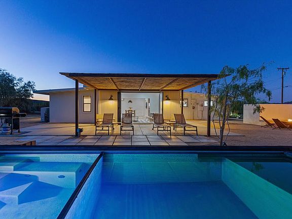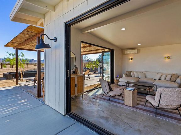 Nestled on a pristine 3-acre parcel in the heart of Joshua Tree, 4610 Sunkist Road is a one-of-a-kind architectural retreat blending refined Mediterranean influences with modern desert minimalism. This 3-bedroom, 1-bathroom home spans 1,568 sq ft and has been meticulously reimagined with a design sensibility rarely found in the high desert. Currently utilized as a top-performing, meticulously maintained Airbnb.Design-forward details include smooth plaster walls, polished concrete floors, handcrafted tiles, and expansive folding glass doors that dissolve the boundary between indoors and out. A luminous open kitchen, two distinct living areas, and curated finishes throughout create a space as functional as it is striking.Step outside to a heated Modpool/spa, sculptural fire feature, shaded lounge areas, and panoramic views framed by olive trees and southern mountains. With 32 owned solar panels, EV charging, and a fully fenced footprint, this ultra-private, turnkey haven is just 8 minutes from the park--perfect for discerning buyers seeking a unique retreat and great investment opportunity.