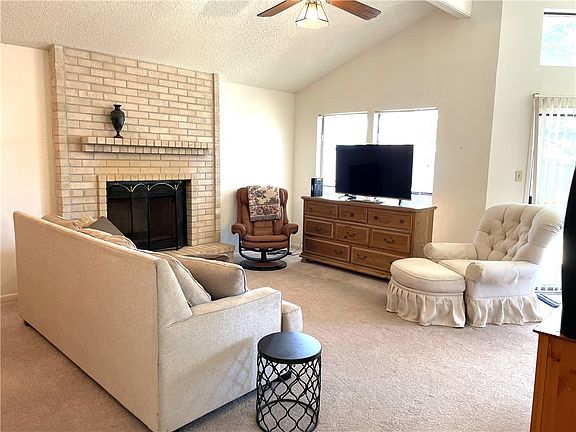 Brick fireplaceWell kept homePool sized backyardWarm inviting spaceNatural lightCovered patioVaulted ceiling