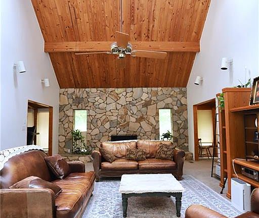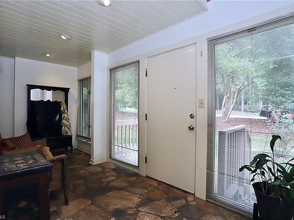 Experience the beauty of historical Sedgefield in this 1970’s contemporary design home. Nestled on over half an acre, surrounded by mature trees and landscaping. Formal entrance hall with stone flooring opens on either side to the grand cathedral living room. Floor to ceiling stone accent wall/gas fire place brings your eye up to the natural wood-clad ceiling. Flanking the living room are a dining room & a study w/wood ceilings & wall of windows overlooking the wooded back yard. The Kitchen features stainless appliances, granite counters & plentiful cabinet and pantry storage. Primary bedroom suite located on main level along w/laundry room, half bath and office/flex located off front entry foyer. 3 additional bedrooms, loft area & full bath located on upper level. Enjoy the outdoors on the 12’x12’ back deck. Garage is climate controlled w/workshop area & 3-phase electrical. Join the Sedgefield Country Club and play the Grandover golf course! Schedule your tour today!