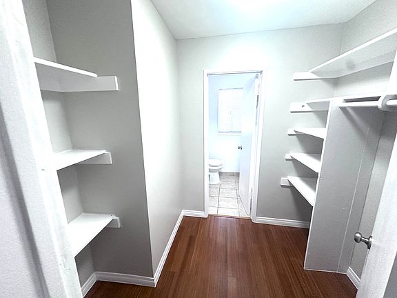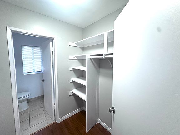 The bathroom has been refreshed with bright white tile, updated fixtures, and plenty of natural light, while the walk in closet offers generous shelving and storage to keep everything organized.