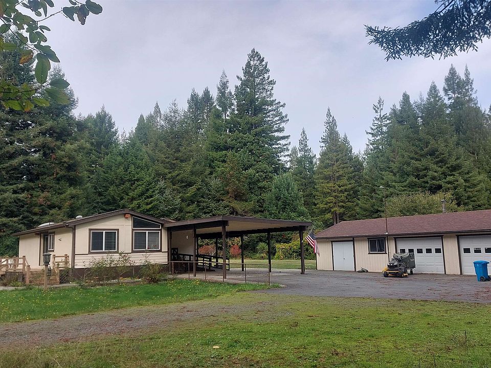 End of road gated property shown by appointment. A rare find located in the heart of 2 Green Acres—this sunny and all-usable property is a tranquil retreat surrounded by a graceful perimeter of mature redwood trees. Bathed in natural light and brimming with thoughtful upgrades, this 3-bedroom, 3-bathroom home blends comfort, functionality, and beauty in perfect harmony. Step inside to discover a perfectly functional kitchen featuring abundant cabinetry, a large pantry, pullout shelving, and a charming second vegetable sink—all part of a quality remodel designed for both ease and elegance. The living room welcomes you with open-beam vaulted ceilings, skylights that pour in sunlight, and lovely French garden doors that frame views of nature beyond. The master suite is a true sanctuary, offering two master bathrooms—one with a deep soaking tub—and an immense walk-in closet that includes a built-in office space. Outside, a sprawling Trex deck wraps around the front of the home, inviting you to relax and soak in the serene surroundings. The property also boasts a detached 2+ car garage with a large shop and craft area, plus two generous carports—one conveniently connected to the back of the home, complete with covered ramps for easy accessibility. Designed with comfort and practicality in mind, this home is fully wheelchair accessible, featuring wide open spaces and a roll-in shower with a fold-down seat. Additional upgrades include a heat pump, dual-pane vinyl windows, and a 16,000-watt propane standby generator—ready to power the entire home when needed. Three enclosed garden areas offer endless possibilities—grow your own produce, tend fruit trees, or repurpose the corral as a chicken coop. With partial fencing, a private gated entrance, and a peaceful setting at the end of a quiet country road, this exceptional property offers both privacy and convenience. Come take a look—you’ll find that this unique home offers not only modern comfort, but a lifestyle surrounded by nature, space, and serenity.