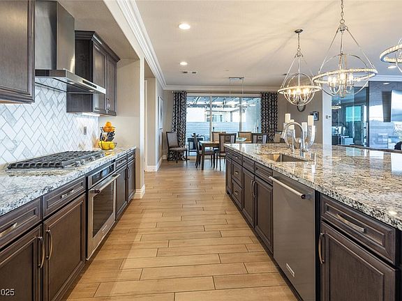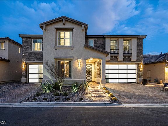 LUXURY HOME WITH PANORAMIC VIEWS. This stunning 5288 SF (w/ Loggia) residence has been highly upgraded. It offers luxury living in every detail in this 5 bedroom/ 5 bath home. This home is nestled in The Views of the Hidden Hills community. It boasts hundreds of thousands of dollars in upgrades throughout which must be seen to be appreciated. The outdoor living spaces re paradise with two patios, an upstairs Loggia with a fireplace and tv, a full outdoor covered kitchen with fridge, barbecue and bar, a pool and spa with mood lighting, wet deck and waterfall. The loggia, pool or bar offer stunning evening views of the strip and mountains. Home has built in Sonos sound system, upgraded custom lighting throughout, customized walk in closets, crown moulding, upgraded baseboards, upgraded custom pantry with stone counter, custom tile in all bathrooms, tiled courtyard, custom entry, motorized shades, and custom glass doors added to office and more!