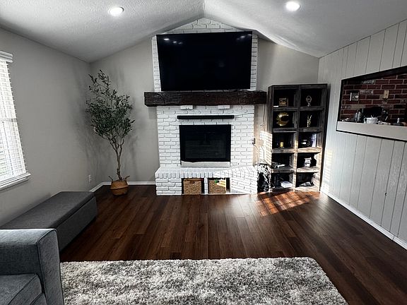 The living room features a cozy fireplace where you can gather on chilly nights, while the backyard is a dream for kids and families with a playground set already in place.