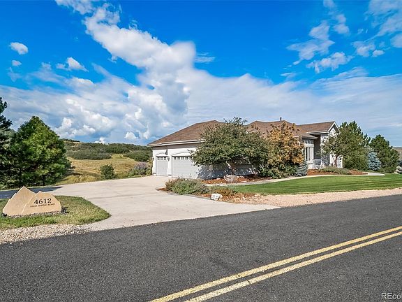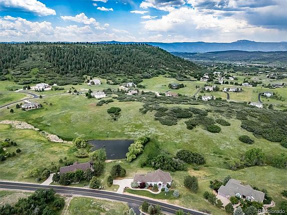 This exceptional ranch-style retreat is situated at the foot of Bell Mountain on a serene 4.5-acre lot complete with a tranquil pond and sweeping views of rolling hills and wide-open vistas. A covered front porch sets the stage for welcoming guests, while the front door opens to a dramatic wall of windows that frame the scenery and bathe the interior in sunlight. Elegant hardwood floors guide you through the main level. The great room impresses with soaring ceilings, a cozy gas fireplace, and seamless flow into the dining and kitchen areas. The formal dining room is the ideal setting for memorable dinner parties and family celebrations. The chef’s kitchen is a true showstopper, featuring slab granite countertops, rich maple cabinetry, a gas stove with additional wall oven and microwave, and a generous walk-in pantry. A wraparound buffet provides the perfect spot for serving appetizers and drinks. The sunny breakfast nook leads out onto a covered back deck, designed for effortless indoor-outdoor living. The spacious primary suite is a peaceful retreat with access to the covered deck, a luxurious 5-piece bath, and a large walk-in closet. An office on the main level has built-in bookcases and a closet, and could be used as a bedroom. A huge laundry room with sink and lots of folding space is so convenient, while the 3-car garage is accessed through an owner’s entry with mudroom-style closet. The finished walkout basement adds even more living space, with two bedrooms with their own baths, a large recreation room with gas fireplace, and plenty of storage. Outdoors, part of the yard is fenced for pets and play, while the rest of the acreage remains open, surrounding the home with the natural beauty of gamble oak and natural grasses. Bell Mountain Ranch is mere minutes from downtown Castle Rock and I-25, and features miles of trails for hiking or riding horses. Wildlife sightings are plentiful, making every day feel like a Colorado getaway. This property is a must see!