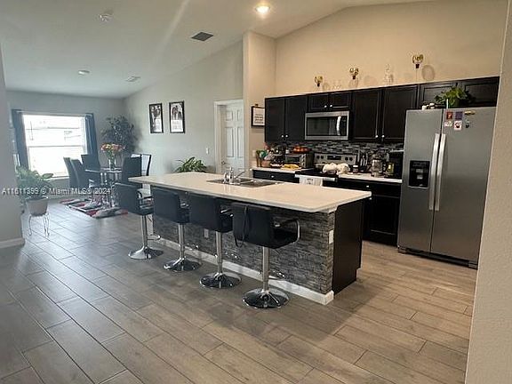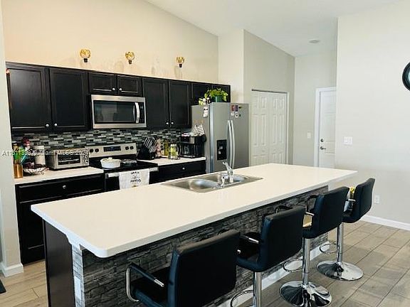 Amazing 4 bedroom,3 bath,2 car garage with a beautiful screened in lanai and oversized d/way.Gorgeously landscaped front and back yards, w/paver deck in backyard and around the house, brand new white vinyl fence, new gutters, new garden shed, new flood lights. Kitchen featuring sleek stainless steel appliances, modern backsplash, quartz countertops and a big island.Elegant and modern18" tile floor in living areas&carpet in all bedrooms. Master Bedroom with chic tray ceiling leading to his and hers walk-in closets and comfortable master bath w/dual vanities,wood cabinets& linen closet,modern rain shower head & stylish design tiles. Garage upgraded w/floor Epoxy. Laundry Rm w/New Samsung front loaders W/D.Ring Cameras & Doorbell package included.Easy access to Tpike &I95 and 5min to Publix.