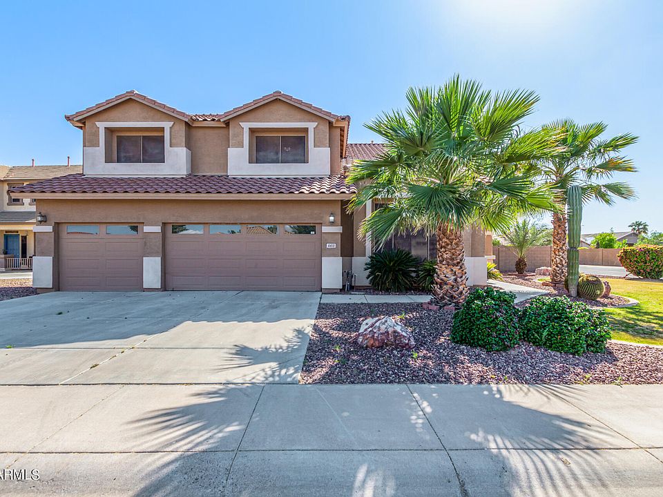 Welcome to this lovely 5-bedroom, 3-bath home on a desirable corner lot! You're greeted by a 3-car garage and a well-maintained front yard. Discover a living room with vaulted ceilings, recessed lighting, blinds, and durable tile flooring. The family room is perfect for cozy evenings with loved ones. The eat-in kitchen comes with solid surface counters, abundant wood cabinetry, SS appliances, a pantry, and a center island. The versatile loft is ideal for additional living space or play area. Double doors lead to the main bedroom, complete with an ensuite with dual sinks and a walk-in closet. The backyard features a covered patio, a warm fire pit, and plenty of space to create your dream oasis. The Community offers a lush greenbelt, playground, basketball court, and more. See it now!