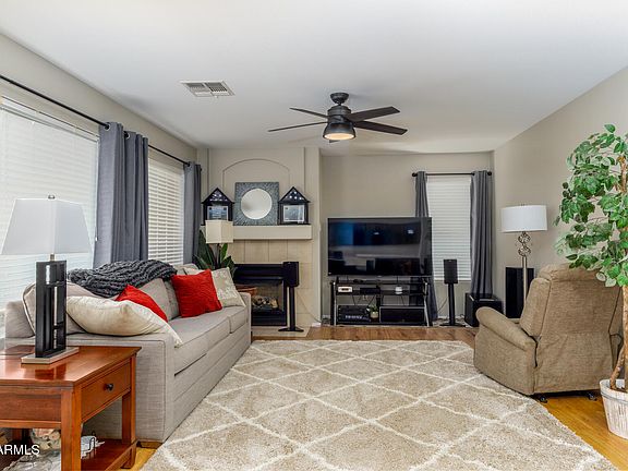 Beautifully maintained 4BR/3BA, 2,132 sf home in the gated community of Dove Valley Ranch. Formal living and dining rms flow into the remodeled kitchen featuring quartz counters, new stove, island breakfast bar, eat-in area opening to family rm with fireplace. Vaulted ceilings enhance natural light t/o. Spacious primary suite offers mountain views, walk-in closet, dual sinks, soaking tub, shower. Two additional upstairs bedrms include walk-in closets. New carpet. Downstairs bed w/ full bath features therapeutic walk-in tub—ideal for multi-gen living. North-facing backyard with no neighbors behind and stunning views. Energy-efficient solar, new windows (2020), new roof (2020), new HVAC and water heater (2023). Walking distance to park. Located w/in minutes to the heart of Cave Creek.