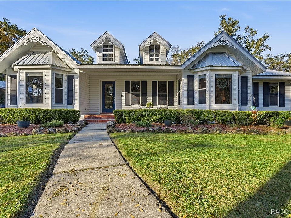 Bay windowsMetal roofHigh ceilingsAttached storageDormer accentsBeautiful dining chandelierWelcoming fenced entrance