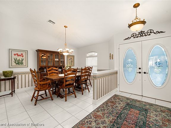 Beautiful, spacious and well maintained! Lush pristine landscaping and a double door entrance greets you into this wonderful 3 bed, 2 bath home boasting just under 1,900 sq. ft. of living space, cathedral ceiling and a bright & open split floor plan. Cook and bake your favorites in the grand kitchen with Corian countertops, stainless steel appliances, breakfast bar for 3, lots of cabinets and pantry. Enjoy your meals in the cozy breakfast nook and the formal dining room with enough space for a hutch or China cabinet. Living room has access to the large, tiled porch. Spacious master bedroom features lovely wood-like vinyl floors, trey ceiling, walk-in closet and a beautifully remodeled ensuite with granite dual sink vanity, linen closet, corner tub, walk-in tile shower and water closet. With 2 other bedrooms you'll have space for a guest room and an office. Just off the kitchen is the laundry room with cabinets, sink, washer and dryer included. Roomy 2 car garage with extra wide driveway and per sellers, driveway was recently painted spring of 2024 and exterior painting done in 2023. Other great updates include 2022 roof and 2020 AC. Located just a few minutes from US Hwy 27 and a short drive to shopping, restaurants and Advent Health Hospital. This is a great community where you can golf year round, enjoy a nice meal in the Island View lakefront restaurant, enjoy the dog park, spend an afternoon with the family at the playground, basketball courts and bridge to island with gazebo surrounded by the lake. With a membership you can enjoy the amenities of the pool and fitness center. The special district fee covers the upkeep of the community and roads of Sun N Lake and includes 24 hr security of the community.