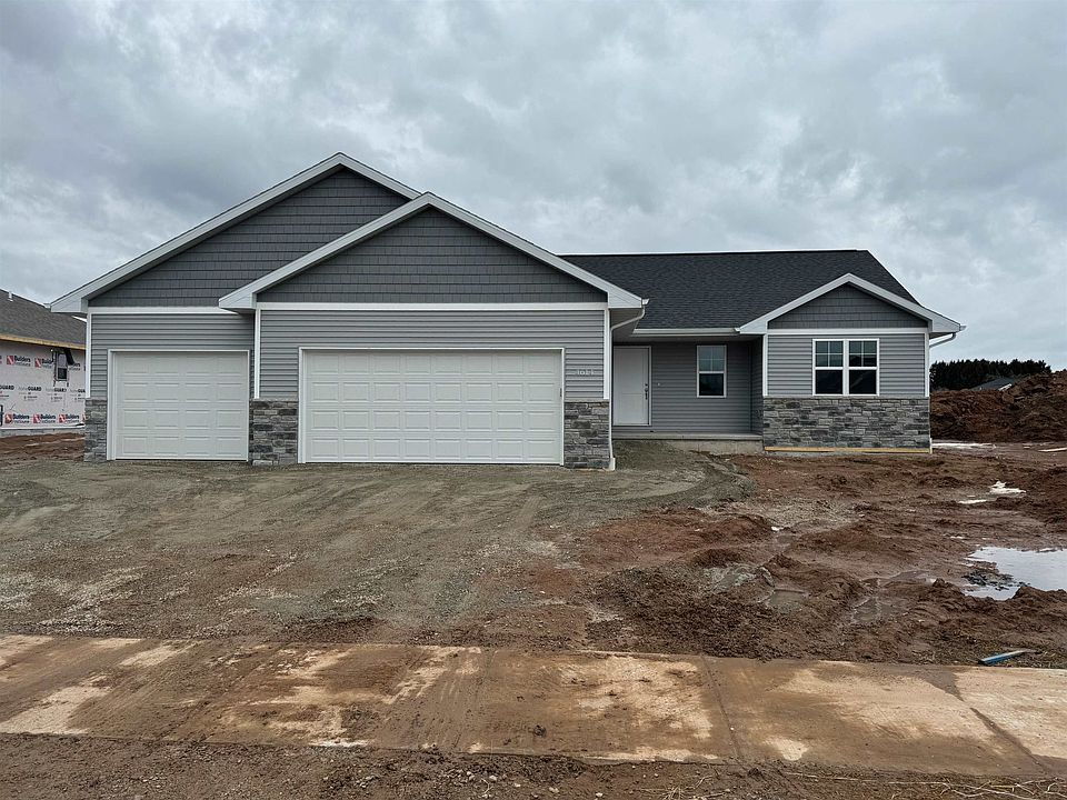 Stunning newly built 1,461 square foot ranch-style home located in the Village of Howard. This home has a split bdrm layout, welcoming you w/a spacious foyer that leads to a LR w/cathedral ceilings. The beautiful dinette & kitchen showcase custom maple cabinets, an island w/snack counter & sink, & SS dishwasher & microwave. The master bdrm has a walk-in closet & private bath featuring a walk-in shower. Enjoy the convenience of first-floor laundry. The bsmt has egress & plumbing in place for a future bath. Park w/ease in the attached 3-stall garage. Outside, the home has vinyl siding, stone per plan, shakes in the roof peaks, & charming covered porch. Virtual staging in photos.