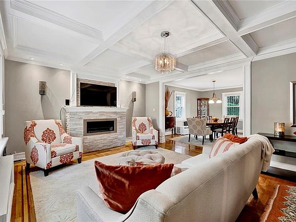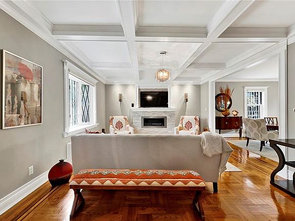 Welcome to this stunning fully detached single-family home situated on a spacious 3,950 sq ft lot in the highly desirable Flatlands neighborhood, bordering Old Mill Basin and Flatbush. This beautifully maintained, move-in-ready residence blends timeless charm with modern upgrades and offers exceptional indoor and outdoor living. Featuring 3 bedrooms, 3 bathrooms, a finished basement, a long private driveway, and a rare detached 3-car garage. Enjoy peace of mind with modern security features, including an ADT alarm system, Ring doorbell, surveillance cameras, and a newer roof. Enter onto the welcoming front porch and into a cozy foyer with coat closet leading to a bright living room with refinished parquet floors, elegant, coffered ceilings, and an eco-friendly ethanol fireplace. A wall-mounted AC unit ensures added comfort. The formal dining room flows into a well-designed eat-in kitchen featuring granite countertops, abundant cabinetry, a breakfast bar with extra storage, stainless steel appliances, pendant and recessed lighting, and a convenient half bath. The kitchen also offers access to the side yard and finished basement. Upper level are three spacious bedrooms. The primary bedroom has ample closet space, while the other two rooms serve as a gym and home office. The renovated bathroom features a skylight above a freestanding soaking tub, a glass-enclosed walk-in shower, double vanity, recessed lighting, and designer tile work. Attic access adds bonus storage. The finished lower level includes a large bedroom, bonus room, wet bar, shower bath, laundry area with stackable washer/dryer, utility and meter rooms—ideal for home office or extra space. Enjoy a beautifully paved backyard, private driveway, and detached 3-car garage. Close to BM1, B7, B41, B44, B103 buses, and #2/#5 trains at Flatbush Junction, with easy access to parks, shops, and dining.