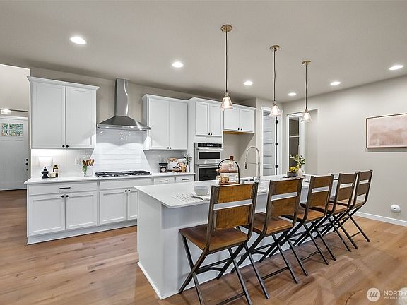 Experience refined living in this Eaglemont Custom new construction Featuring 4 bedrooms plus a versatile den/guest room and 2.75 baths, this home exudes modern sophistication. The gourmet kitchen impresses with sleek white cabinetry with quartz countertops, stainless steel appliances, and a double oven—perfect for the discerning chef. Elegant engineered hardwood throughout the main living area, white interior doors, and trim create a timeless aesthetic. Indulge in the spa-like primary en-suite with soaking tub, a serene retreat designed for ultimate relaxation. Impeccable craftsmanship and contemporary luxury await in every detail of this exquisite new construction home. Multi Mood changing electric fireplace will be added.