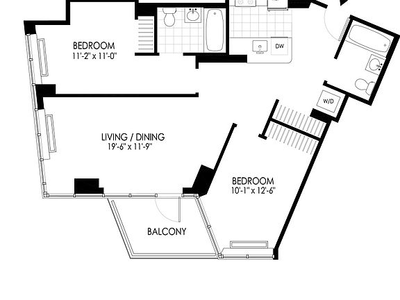 Amazing 2 bed, 2 bath apartment featuring an open kitchen, spacious living/dining area with floor-to-ceiling windows, corner bedroom, in/home washer/dryer, ample closet space, and a private balcony with southwest exposure and partial river views.