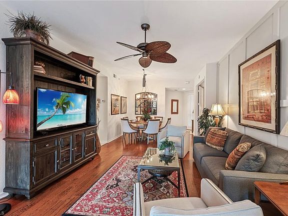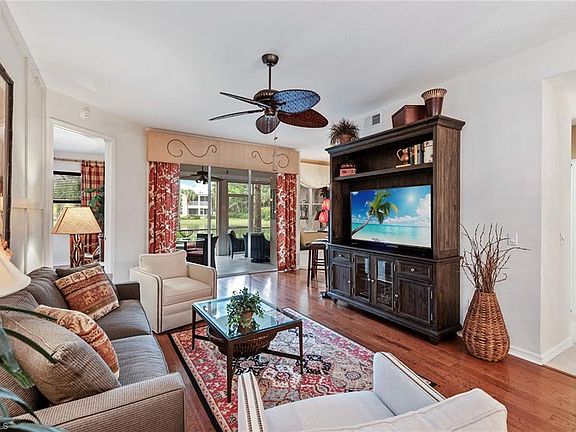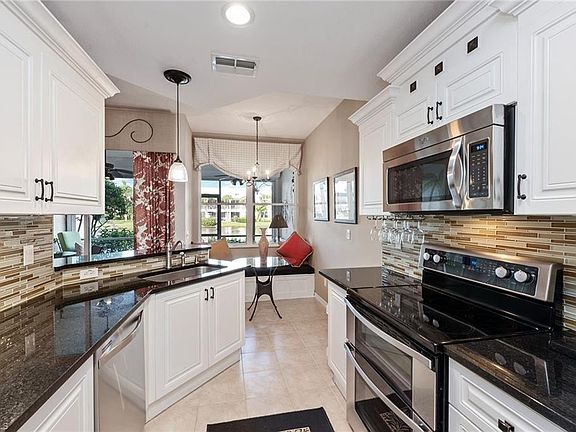 Amazing lake and fountain views await you in this 2-bedroom + den, 2-bath condominium located in Hawks Nest in the award-winning Fiddler's Creek community. Walk up to your courtyard entrance and step into your beautiful, turnkey-furnished condominium with a new roof. The spacious living area offers wood flooring, ceiling fans, and sliders that open onto the lanai. The eat-in kitchen boasts white cabinetry, stainless steel appliances, a pantry, breakfast bar and bay window with bench seating. Relax in the master suite featuring wood flooring, a lovely water view, a large walk-in closet with built-in shelves plus en-suite with dual sinks and a separate shower. The additional bedroom is ready for your guests, along with an additional updated, full bath. The den can be used as a home office, exercise, or craft room. The tiled, screened-in lanai offers a tropical wall painting with peaceful lake views. Fiddler's Creek offers award-winning amenities such as an 18-hole golf course, a resort-style pool with waterfall, tennis courts, pickleball, fine & casual dining and much more. Close to Marco Island and Naples beaches as well as shopping and dining.
