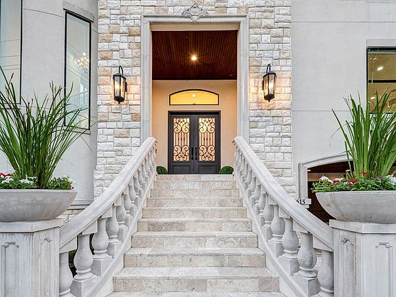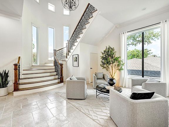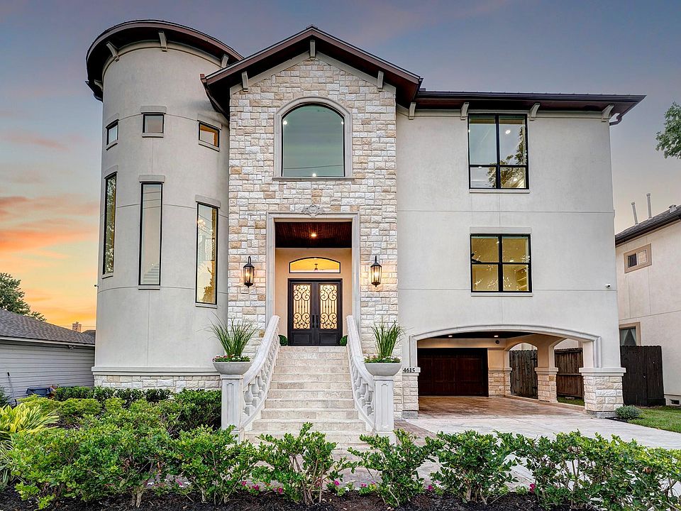 Welcome to this architecturally inspired masterpiece in the heart of Bellaire. Completed in 2019, this stunning spacious home has 5 bedrooms and 6 ½ baths on a large beautifully landscaped lot inside the Loop. The stately elevated façade is composed of stucco, stone and cast stone. A porte-cochere leads to an oversized garage with an exceptional storage area. Inside, the grand foyer with piano alcove/sitting area has access to a guest suite, study and the sweeping staircase. The island kitchen boasts Viking appliances, quartz counters and adjacent breakfast room, and flows to the great room with fireplace, bar area and formal dining room. A covered porch with fireplace overlooks the lushly landscaped back yard. Upstairs find a spacious den/game room, elegant primary suite and 4 additional ensuite bedrooms plus third level flex room with bath. Solar panels, 2 utility rooms, water softener and elevator closets, all per Seller.