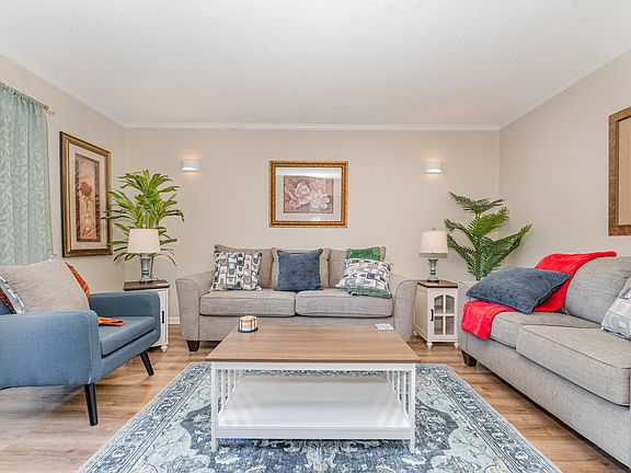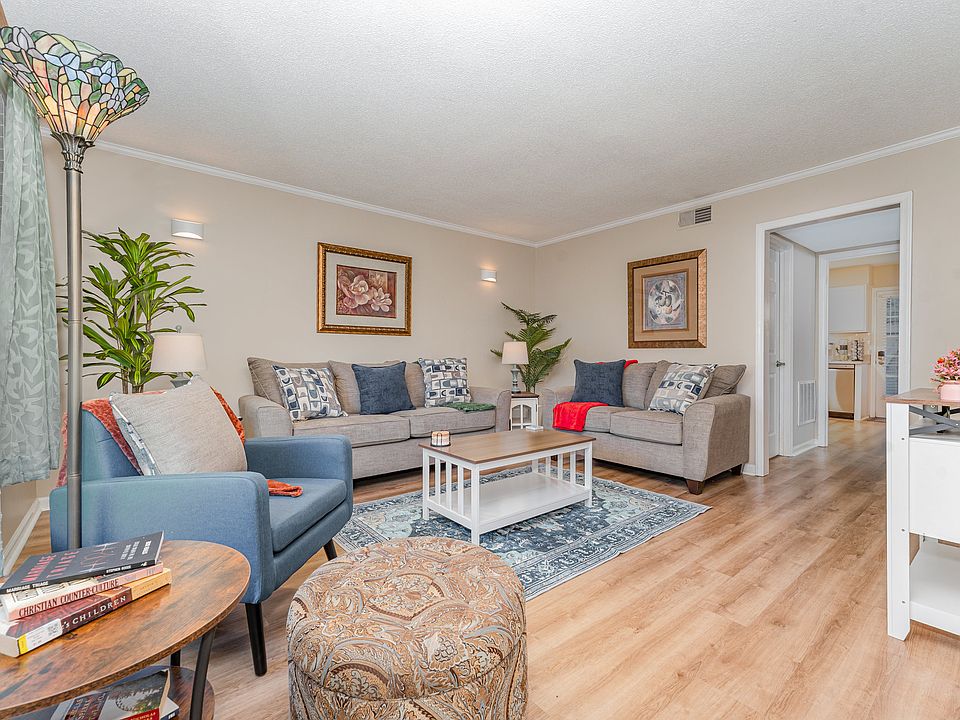 Welcome to our beautifully updated two-story condo and enjoy the comfort and privacy of living in your own home. With a private entrance and no one above you, quiet evenings and restful nights come naturally here. The bright, open living space is tastefully furnished with new modern pieces and warm lighting that instantly makes it feel inviting. A large, comfortable sofa set and accent decor make the living room perfect for relaxing or streaming your favorite shows on the Roku TVs included throughout the home.