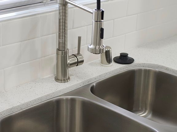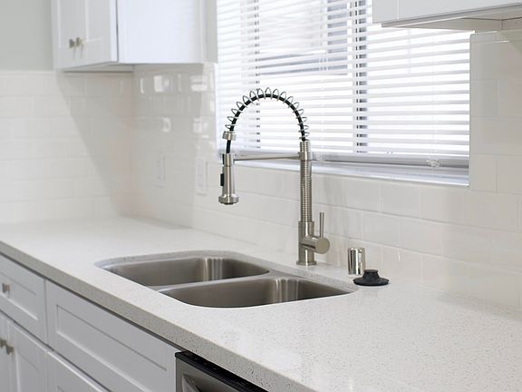 Renovated white kitchen with contemporary design & stainless steel appliances