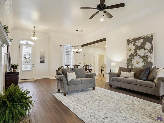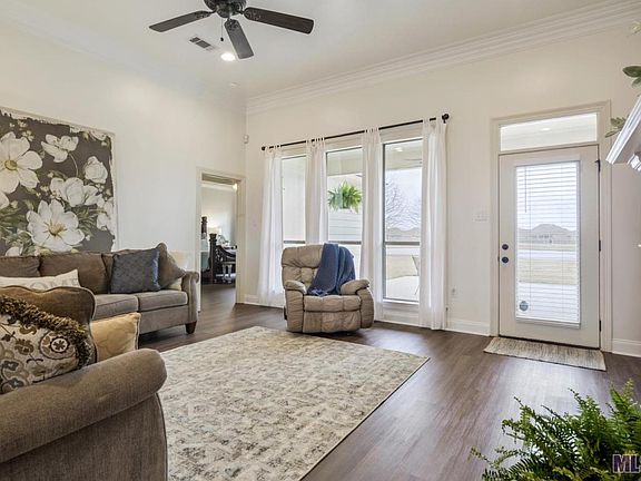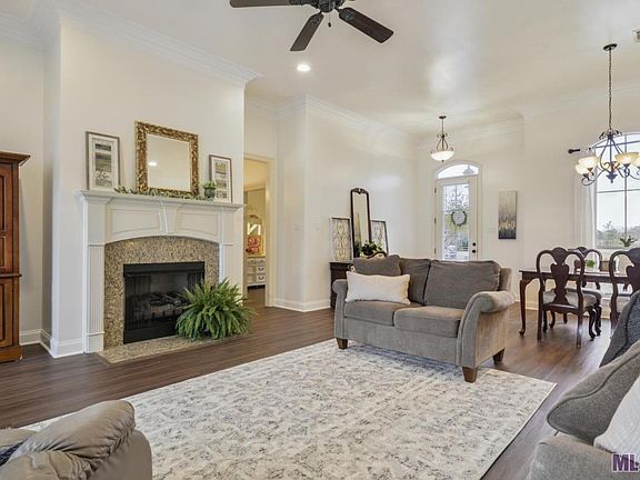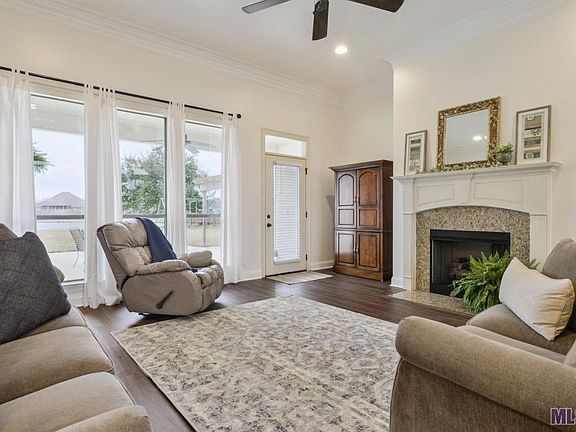 Come see this exceptional, custom home-built By Bogan Construction, which is located on one of the largest lake lots in Sugar Mill. This three-bedroom, two bath home features an open floorplan with nine' and ten' ceilings throughout, newly installed laminate hardwood floors, so you will find no carpet here! The living room features a ventless, gas log fireplace and lovely views of the lake. Lots of windows in the dining room and living room, as well as across the back of the home, allow for plenty of natural lighting. This roomy kitchen features a pantry, electric stove top, and island/breakfast bar, beautiful custom cabinets, and a well-appointed laundry room. The crown molding throughout this home, plus new interior, and exterior paint (Alabaster White) make this home MOVE IN READY! The master bedroom has an ensuite with dual vanities, separate shower, soaker tub and a private water closet. The large primary closet provides ample space for storage and organization. The additional bedrooms are a good size and include walk-in closets. The backyard patio has been extended with splendid views of the lake anytime of the day. It is the perfect spot to add an outdoor kitchen and the television mount remains. This home is located in the highly sought-after Brusly school district and is convenient to shopping, restaurants, the interstate and the new bridge. Call now for your private showing! This one will not last long.