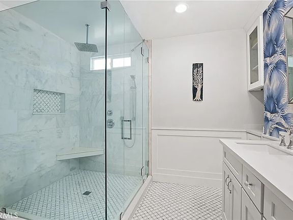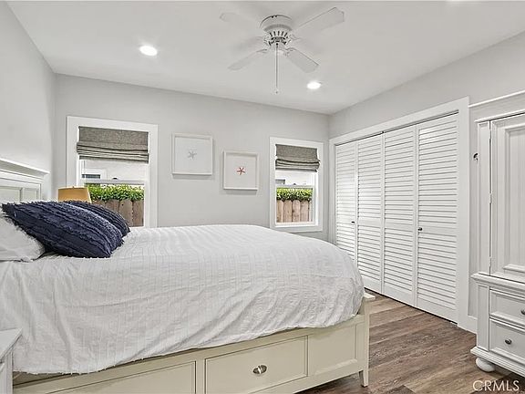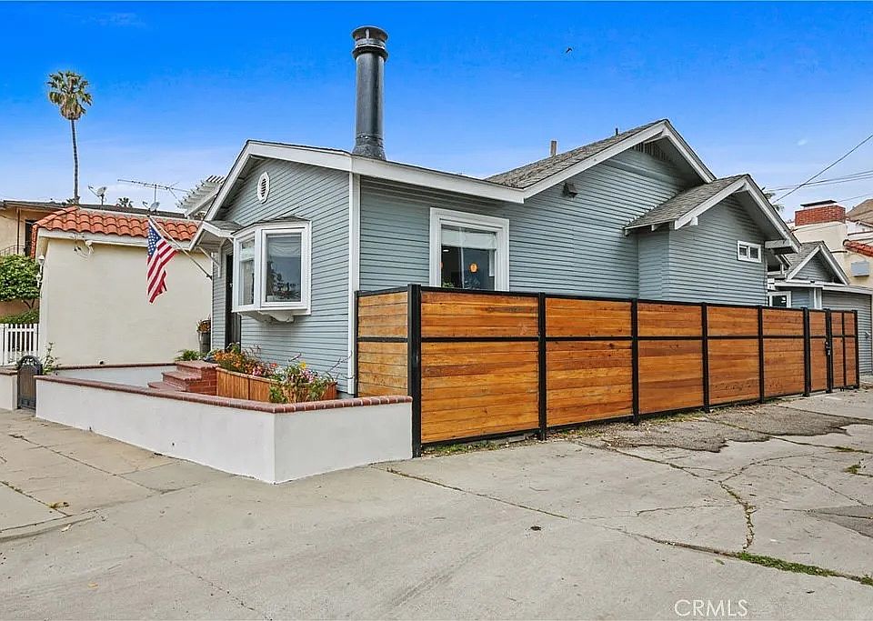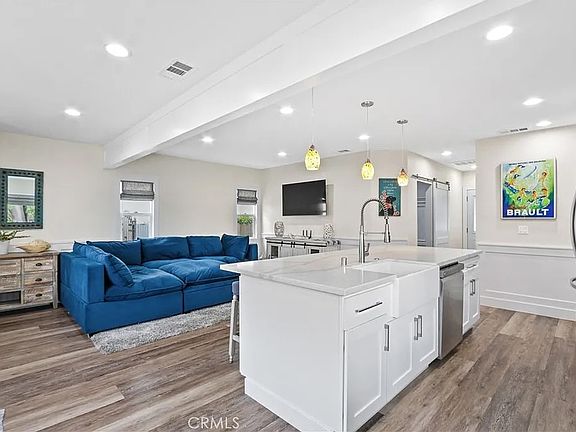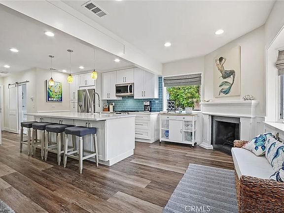 Belmont Shore bungalow beautifully remodeled for modern coastal living. This light-filled home features an open-concept layout with ocean breezes flowing through the living, dining, and kitchen areas. The chef's kitchen offers white shaker cabinets, quartz counters, glass tile backsplash, a large island with seating, farmhouse sink, abalone pendant lights, and LG stainless appliances. The living area includes custom wainscoting, a cozy fireplace, and laminate plank flooring. The elegant bath boasts marble tile, dual vanity, and built-in linen storage. Enjoy recessed lighting, central HVAC, and updated electrical panels. The detached all-electric rumpus room includes a 3/4 bath and laundry hookups, perfect for guests or an office. Ideally located near 2nd Street shops, restaurants, beaches, and top-rated schools.