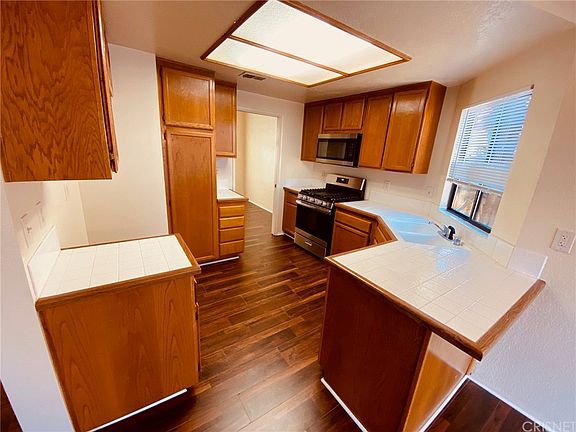 Palmdale's finest 4 bedroom with 2.5 bathroom remodeled home, fantastic curb appeal, step into your formal entry with high vaulted ceilings and brand new wood style floors, warm yourself by the fireplace, great living room and formal dining area, step into your cooks kitchen with brand new stainless steel appliances, lots of re-stained oak cabinets, informal dining area and family room also have new wood flooring, downstairs half bathroom, plus indoor laundry area, upstairs all new paint and carpet, large master suite with en-suite with double sink and large garden tub, three more bedrooms and a full bathroom, three car garage, large entertainers backyard with a great patio area for your BBQ and weekend relaxing.