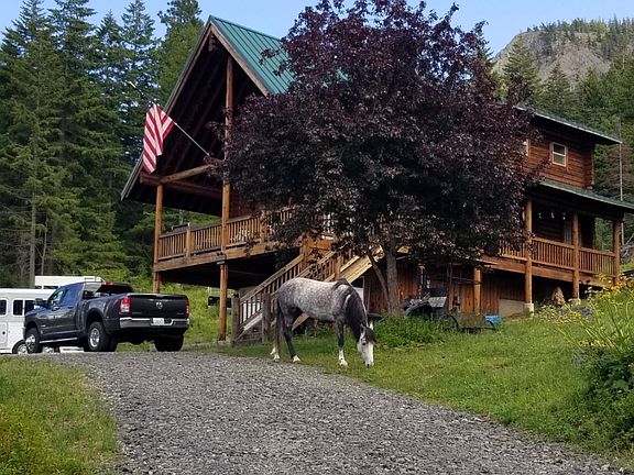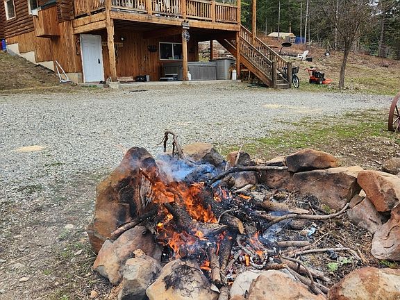 Custom Log home on 10 acres of mountain tranquility on a private dead-end road. Well maintained and cared for. Private well. Beautiful Stuart Mountain views from the large, covered deck. Picture windows and vaulted ceilings. Garden tub in 2nd bath. Fully Fenced and currently set up with 6 stalls and paddocks and round pen for horses but seller can remove panels. two 20 foot containers for dry (hay) storage. Newer hot tub on lower covered patio and a big bonfire area just outside. Tons of parking for all your toys! No HOA
