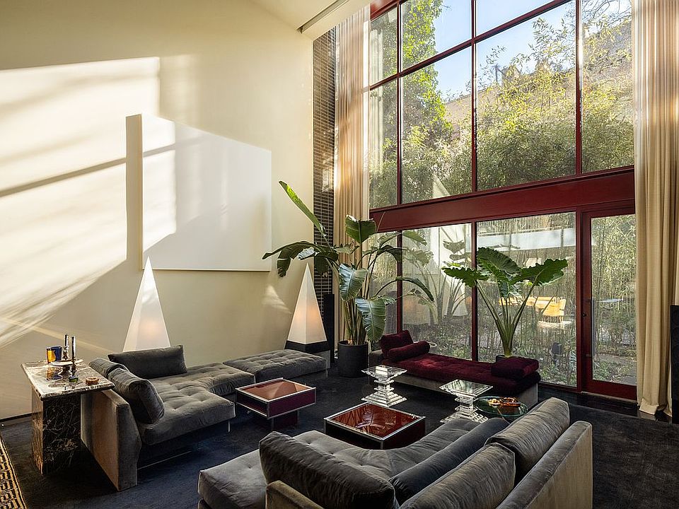 A moody entrance gallery, grounded by terra cotta tiles sealed in glossy black epoxy, sets a dramatic tone for what lies ahead—a breathtaking entertaining space defined by soaring 20-foot ceilings and expansive floor-to-ceiling windows that allow all-day sunlight to pour in through the lush, private, south-facing bamboo garden.