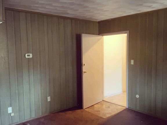 Wall to wall carpetElectric stoveVinyl flooring in kitchen