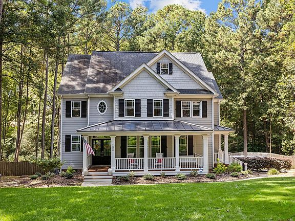 Custom built in by award-winning DJF Builders, known throughout the Triangle for creating high-end homes. Nestled on a beautifully landscaped 1.16-acre homesite, this property features a huge fenced backyard, firepit, screened porch, spacious deck, and a 2-car side-entry garage—perfect for entertaining, play, and everyday living. Step inside to find gorgeous engineered wood floors that flow throughout both levels (excluding wet areas). The welcoming foyer impresses with arched entryways, crown molding, and a soaring two-story ceiling. The formal dining room is accented by a coffered ceiling and chair rail. In the kitchen, recessed lighting and crown molding highlight custom painted cabinets that extend to the ceiling and are finished with brushed nickel pulls. A charming arched opening above the sink creates an open, connected feel to the family room, while stainless steel KitchenAid appliances—including a range/oven, microwave, and dishwasher—complete the space. The spacious family room is anchored by a gas log fireplace with slate surround and custom trimwork to the ceiling, flanked by matching built-in bookcases. Upstairs, the enormous owner's retreat showcases a tray ceiling, crown molding, and wood flooring. The adjoining spa-like bath offers a corner soaking tub, separate tiled shower, and dual vanities. Two additional bedrooms and a versatile bonus room complete the second floor. A finished walk-up attic expands the living options with a large bonus room, full bath, additional bedroom, and flexible space ideal for a home office, playroom, or guest suite.