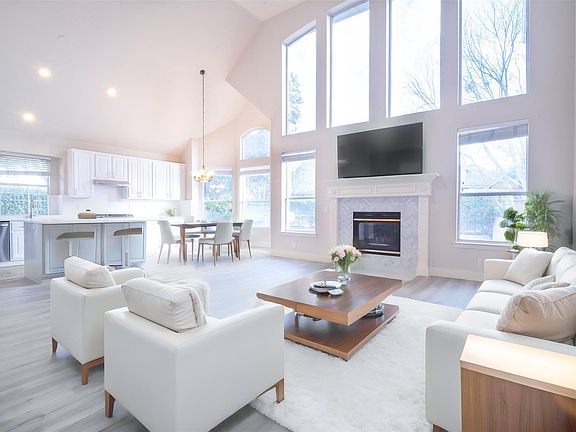 The main living room is a sanctuary of light, anchored by a charming fireplace and a stunning wall of windows that reach from floor to ceiling. The heart of the home, the kitchen, is a culinary dream with a large island, sleek quartz countertops, and a custom designer backsplash. Retreat to the spacious primary suite on the main level, where the en-suite bathroom offers a spa-like experience with a large garden tub, separate shower, dual sinks, and a massive walk-in closet.