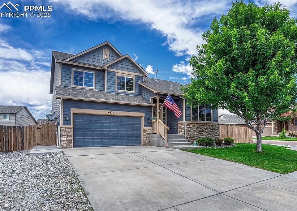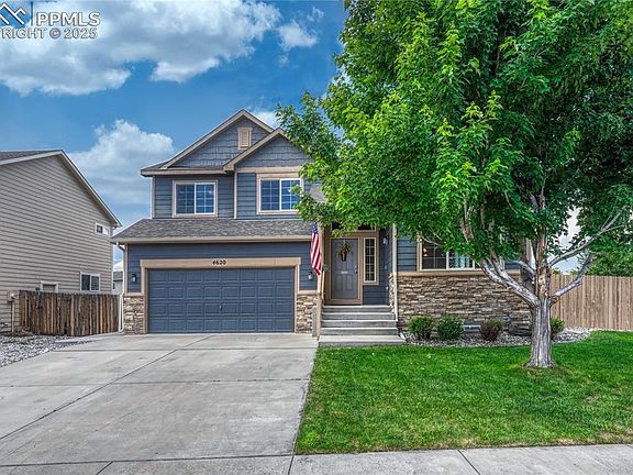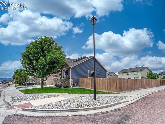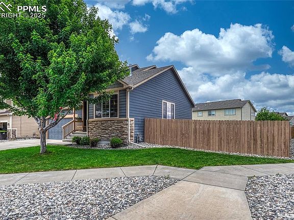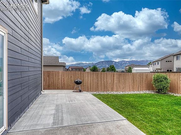 Situated on a spacious corner lot with breathtaking views of Pikes Peak, this beautifully updated home offers the perfect blend of comfort, style, and functionality. Step inside to find brand new carpet throughout and gleaming hardwood floors on the main level. The upgraded kitchen features granite countertops, stainless steel appliances, and ample cabinetry—ideal for both everyday living and entertaining. The bright and inviting family room opens directly to the backyard, where you’ll enjoy an extended patio—perfect for outdoor dining or relaxing while taking in the sweeping mountain views. The FENCED and landscaped yard provides lush green grass and plenty of space to play or gather with friends. Upstairs, every bedroom is equipped with its own ceiling fan for added comfort. The spacious primary suite offers stunning mountain views, a luxurious five-piece bath, and a generous walk-in closet. A large tandem garage provides flexible storage or parking for multiple vehicles with natural light. Conveniently located near military bases, the Powers Corridor, Bluestem Prairie Open Space, reservoir, parks, and schools—this home delivers unmatched convenience and Colorado beauty in one amazing package!