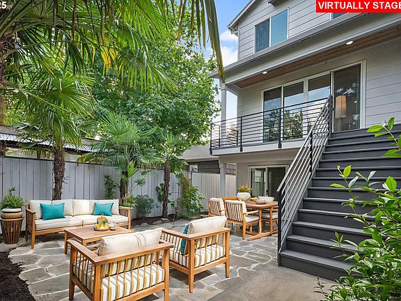 OPEN HOUSE SAT & SUN 1-3PM. This stylish 5 BR, 3.5 BA residence blends modern elegance with thoughtful functionality. The main level showcases soaring ceilings, custom lighting, and designer wallpaper accents that set a sophisticated tone. At the center of the open-concept design, the chef’s kitchen features sleek quartz countertops, a generous island with seating, and upscale stainless steel appliances. The inviting living room offers a cozy fireplace and sliding doors to a balcony overlooking the beautifully landscaped patio.Upstairs, the luxurious primary suite serves as a true retreat with custom wallpaper, designer lighting, and tailored draperies adding an elevated sense of style and comfort.Outdoor living is equally impressive—relax in the professionally landscaped backyard with palm trees, patio, and fenced privacy, or entertain year-round on the covered deck off the living room.The ground floor offers exceptional versatility with a fully equipped guest suite/ADU, complete with private entrance and expansive patio—perfect for visitors, extended family, or flexible living options.Situated in one of the city’s most desirable neighborhoods, this home puts dining, shopping, and entertainment just steps away. [Home Energy Score = 7. HES Report at https://rpt.greenbuildingregistry.com/hes/OR10241619]