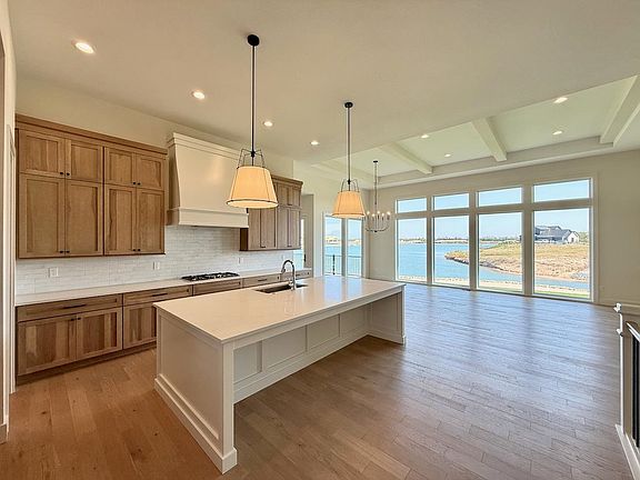 Welcome to The Linden Plan by Nies Homes—where luxury meets lake life in the exclusive Castaway community. Situated on a premium lakefront lot, this home boasts a timeless elevation with rich brick, wood accents, dormer windows, and an elegant arched entryway. Inside, you're greeted by soaring ceilings, a grand living room with floor-to-ceiling windows showcasing breathtaking water views, and a stunning fireplace flanked by custom built-ins. The gourmet kitchen features a 10’ island, gas range, double ovens, walk-in pantry, and endless cabinetry. The luxurious Master Suite includes a spacious bedroom, dual vanities, custom tile shower with dual heads, and a private dressing room. Main floor also offers two additional bedrooms with walk-in closets accompanied by a stylish hall bath, a private office, a convenient half bath for guests, and access to the covered deck. The walk-out basement impresses with 9' ceilings, expansive living space, game room with wet bar, two more large bedrooms, and two baths—one perfectly placed for easy access from your private beach. Step outside to your covered patio and enjoy direct access to the 140-acre spring-fed boating lake. Castaway offers unmatched amenities including a lakeside clubhouse, pool, playground, basketball court, and public beach areas. Live every day like a vacation—right here at Castaway. Some information may be estimated and is not guaranteed. Please verify schools with USD 266.