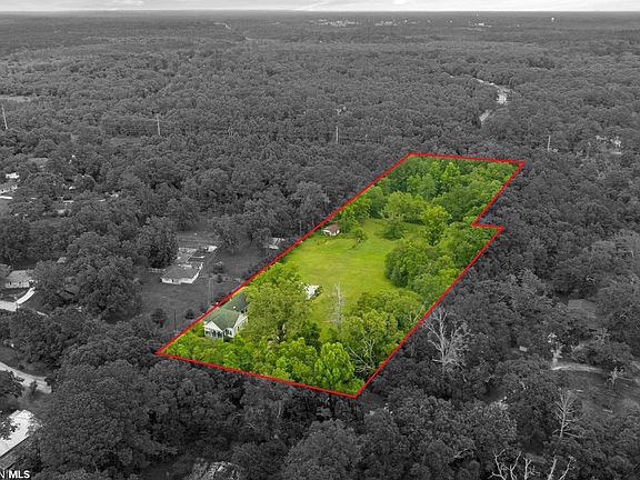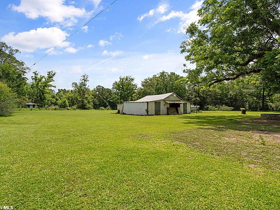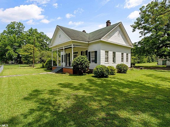 Country feel but amazingly close to town. Beautiful historic home circa 1910 (possibly as old as 1890 due to Victorian architectural elements) on beautiful and private 6.6 acres! 2 miles to Chickasabogue Park, 2.8 miles to the Univ. of Mobile, 3 minutes to the hwy 158/main Saraland exit at I-65, 17 minutes to Downtown Mobile, as well as close to area mills for quicker commute. Per seller, roof is approximately 9 years old, HVAC heating/cooling is 8 years old, water heater is 2018. There are old heating units that aren't used anymore but still remain. Up to 4 bedrooms are possible in this home; it just depends on how you wish to utilize the large rooms. If you prefer to have a formal dining room or renovate the kitchen in another location, 3 bedrooms are possible. Large 10 ft x 25 ft front porch welcomes you into the 25 x 7.5 wide center hall floor plan with Eastlake original door and original patterned glass sidelights/transom. 13 foot high ceilings and original wood floors throughout the home. Original transoms are over the four 15 x 15 bedrooms, two have closets. These four rooms (used as bedrooms) are arranged off the main center hallway. Delicate and beautiful fireplace mantles are in the front bedrooms. A large storage closet with multiple places to hang clothes high and low 7x 5 is attached to the bathroom with tilework in fantastic condition, a vanity, lots of built in storage and a soaking tub. As you head to the kitchen area, there is a large 15 x 14 living room with large hand-carved antique built in bookcase. The kitchen is 15 x 15 and features a gas stove and fridge along with mid century modern style wood cabinetry & formica countertops. There is room for a breakfast table. Off the kitchen is the 30 x 8 porch. Attached to the kitchen was another bath more recently added with a shower and vanity. Attached to the bathroom is a laundry room 7x 7.