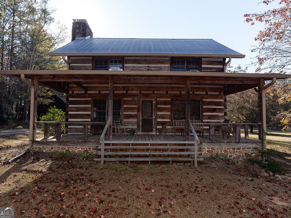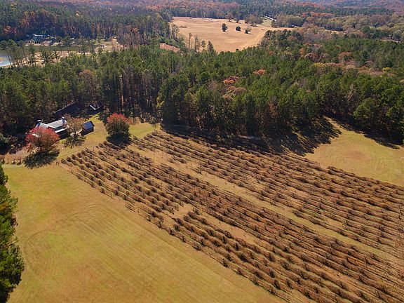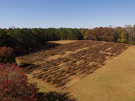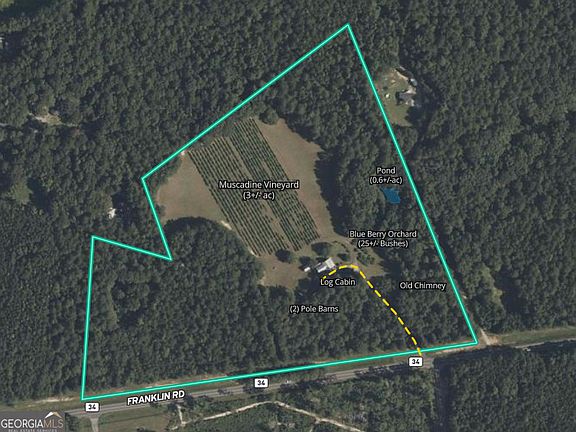 Iconic Harrell's Vineyard - Rare Hand-hewn log home on 30.4 acres, built in 1979. This was the country home of writer/photographer Bob Harrell of the Atlanta Journal-Constitution's Dateline Georgia, and his wife Katherine. The property includes a 3+/- acre muscadine vineyard with 40+/- year old vines (five varieties) and an established blueberry area of approximately 25 mature bushes on about a half-acre. Both have produced consistently for decades. The Harrell family made wine and sold grapes locally, including at the Powers Crossroads Festival. A 0.6+/- acre spring-fed pond sits on the eastern side of the property. The two-story log home includes three bedrooms and two bathrooms. Features include stone and brick chimneys, four fireplaces, exposed ceiling beams, pine flooring, and a metal roof. Chinking is mesh/insulation with concrete. The main level has a large family room and a country kitchen with gas cooktop and an electric cast-iron oven set into the brick fireplace. A screened side porch overlooks the vineyard. One full bath is on the main level. Upstairs are three bedrooms, an additional washroom, one full bath, and walk-up attic storage. An attic fan provides ventilation in the hallway. Outbuildings include a 16'18' +/- log structure with utilities, concrete floor, and metal roof; plus two pole barns measuring 24'70'+/- and 24'47'+/-, all with loft storage. The property has two drilled wells; Buyer should inspect for working order as the current owner had public water ran to the cabin. Kubota Tractor, Kubota Mower, and Golf Cart are included with the Farm. Seller will keep furniture in Home. The home uses gas space heaters, fireplaces, attic fan, and window A/C units instead of central HVAC. The land fronts Franklin Highway. Not enrolled in Conservation Use. Chattahoochee Bend State Park is minutes away. Bottom line: this is a rare combination-established fruit production, authentic log construction, and acreage with real character. Hard to find, even harder to replicate. Call today to schedule your visit! Licensed Georgia Agent required for showing.