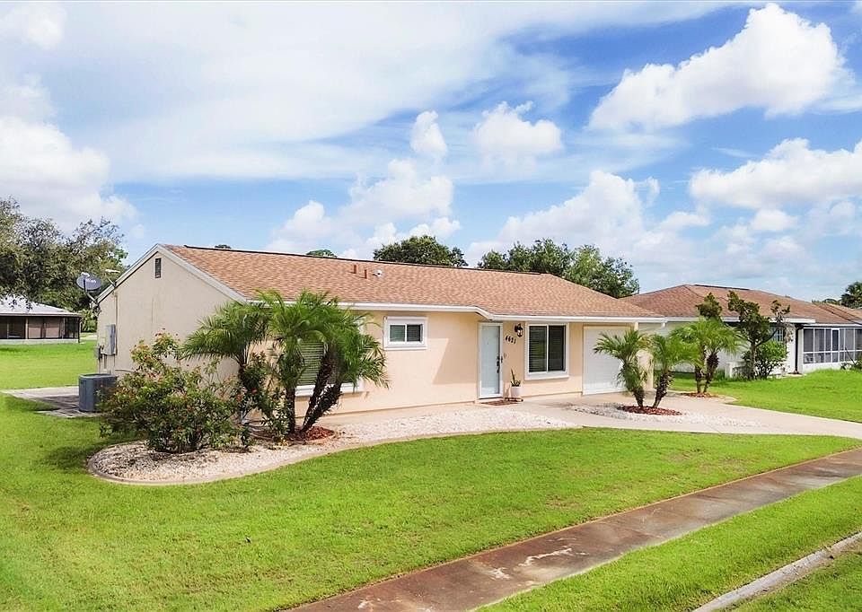 This beautiful 2-bedroom, 1.5-bathroom home with a one-car garage in North Port, Sarasota County, is ideal for a seasonal retreat, first-time buyers, or investors! The home is spotless, featuring front garden curbing, porcelain tile flooring throughout, a new water heater, electrical panel, garage door, windows, and the roof installed in 2017. HURRICANE SHUTTERS provide peace of mind. Nestled in a peaceful community, you can enjoy the Florida lifestyle! Open the front door to a gorgeous living room with abundant natural light and a soothing color palette that creates a comfortable ambiance throughout the home. The kitchen is practical and equipped with a breakfast bar, plenty of cabinets, and granite countertops. The dining area offers a great space for family meals with a pantry closet and sliders to the patio area. The primary bedroom offers ample space, a closet, a ceiling fan, and en-suite bathroom access. The 1.5 bathrooms have been recently updated, featuring access from the primary suite and the dining area, with two single vanities, two toilets, a shared walk-in shower with glass sliding doors, and a convenient linen closet. The second bedroom offers ample space, a closet, and a ceiling fan. The laundry area is located in the single-car garage, with a washer and dryer included. The huge backyard has plenty of room for a pool and ample space for family fun or dogs to run. The concrete area provides additional storage for all your outdoor essentials—perfect for a patio table with chairs, a fire pit, or enjoying your favorite BBQ with family and friends! This property is not only cozy but also worry-free. With its location in a non-flood zone, hurricane protection, and no HOA fees, you'll have peace of mind and more money in your pocket. Conveniently located just minutes away from the famous Warm Mineral Springs Park, shopping, restaurants, and entertainment options. It's walking distance to the Garden of The Five Senses and just a short drive away from the beautiful Gulf Coast beaches, full of activities like shelling, snorkeling, and boating—all within minutes of your doorstep. Don't miss out on this incredible opportunity— a true gem for your Florida getaway or full-time tropical oasis!