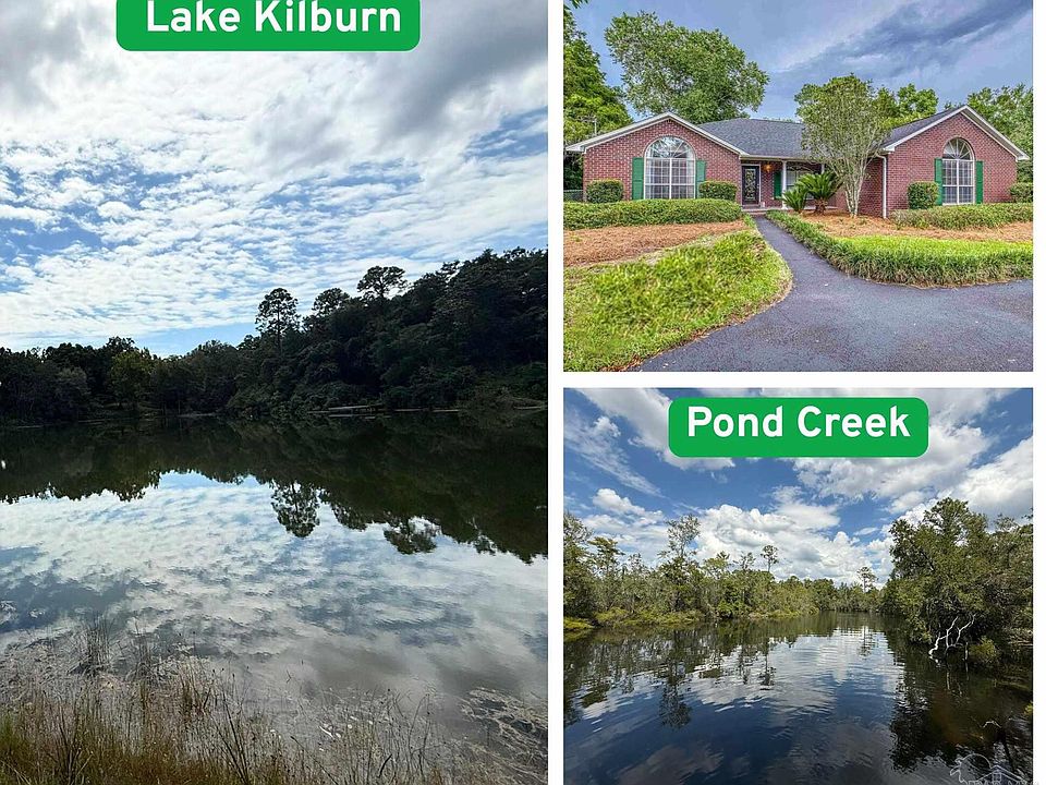 Nestled in the heart of Milton, Florida, this exceptional 9.84-acre estate comprises four contiguous parcels, offering unparalleled privacy and direct access to both Lake Kilburn and Pond Creek. With over 1,000 feet of combined waterfrontage, this property presents a rare opportunity for those seeking a tranquil retreat with convenient proximity to local amenities. The residence features a spacious 4-bedroom, 2-bathroom home designed for comfort and style. A welcoming front porch with an intricate glass front door leads into a bright and airy living room, complemented by high ceilings and abundant natural light. The versatile floor plan includes a large family room, den, or flex space, providing ample room for relaxation or entertainment. The updated kitchen boasts beautiful wood cabinetry with glass inserts, granite countertops, a dry bar area with a granite and tile backsplash, and new stainless steel appliances. Adjacent to the kitchen, the dining area offers scenic views of the lush, landscaped surroundings. The master suite serves as a private sanctuary, featuring a jetted soaking tub, separate shower, double vanity, and two walk-in closets. Three additional bedrooms, each with walk-in closets, ensure ample storage and personal space for family or guests. Outdoor living is enhanced by a climate-controlled sunroom, providing year-round enjoyment of the serene landscape. A walkway leads directly to the deep water of Pond Creek, offering navigable access to Blackwater Bay for boating and water activities. The property is further complemented by a circular driveway, carport, and updated ceiling fans and fixtures throughout. This estate combines the tranquility of waterfront living with the convenience of being centrally located in Milton. Whether you're seeking a private retreat or a place to entertain, this property offers endless possibilities.