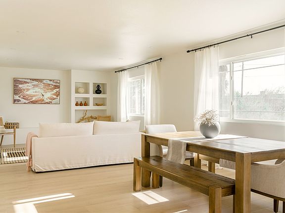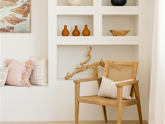 The kitchen is a social hub, featuring rustic cabinetry, a limestone backsplash, designer touches from Zia tiles, open wood shelving, and a large island with seating perfect for entertaining, sipping, and serving. The dining space is open, creating an intimate atmosphere for close friends to enjoy a meal together, and the lighting can be dimmed to set the mood. The sitting area is both a home theater and a gallery space with spot-lit decor and a Frame TV display that transforms from art to entertainment.