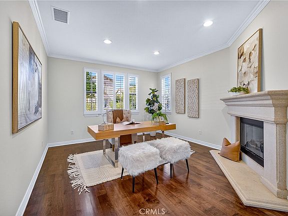 Upstairs, the primary suite is set on its own serving as a serene retreat with custom wood wall trim. The generous spa like bathroom offers a walk-in closet, soaking tub, dual sink vanity, separate rimless glass shower and private balcony overlooking the rolling hills and mature oak trees. Conveniently the laundry room is on this level as well, while a downstairs office offers excellent work-from-home functionality.