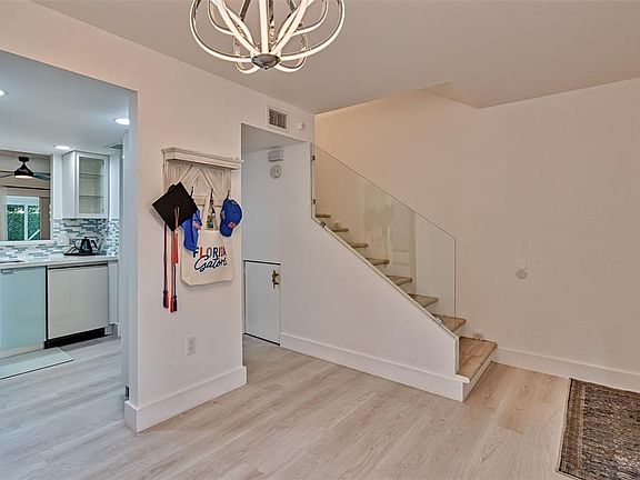 Step into this newly updated house where modern style meets everyday convenience! This remodeled home will delight with modern LED lighting throughout, sleek quartz countertops, fresh luxury vinyl plank flooring, and stainless-steel appliances. Both beautifully updated bathrooms have walk-in showers. Enjoy the private backyard paradise with waterproof composite decking, artificial ivy walls, and a cozy enclosed glass porch that provides the perfect place to escape and relax. With a bright, open feel and tasteful finishes throughout, this home is truly move-in ready. Additional improvements include new AC in 2024, large bedroom and pantry closets, glass staircase railing, craftsman baseboards, Ring Alarm System, and Smart Thermostat. Save money with low maintenance, low utilities, and low HOA fee! Plus, you’re just minutes from shopping/dining at Celebration Pointe, Butler Plaza, top hospitals, and the University of Florida—making it the perfect blend of comfort, style, and location!