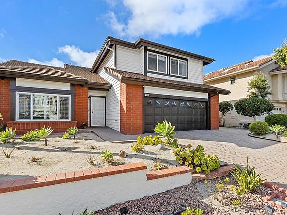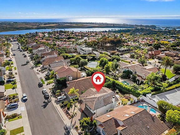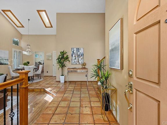 Enjoy the best of beach life in this beautifully maintained Telescope Point home, featuring Agua Hedionda Lagoon views in front and a peek of the Pacific from the back upper deck. Just minutes from Tamarack State Beach and Carlsbad Village, enjoy easy access to restaurants, boutique shopping, and the weekly farmer’s market. This peaceful neighborhood is known for its ocean breezes, pride of ownership and the nearby top-rated Carlsbad schools. Neighborhood ocean view parks are a short stroll away. This home offers 3 bedrooms upstairs, a main-level bonus room, and 2.5 baths, plus a private backyard retreat. The inviting curb appeal features fresh exterior paint, a paver driveway, new roof (2024) and drought-tolerant landscaping. Inside, vaulted ceilings with exposed beam, skylights, plantation shutters, and Saltillo tile create a bright, airy ambiance. The updated chef’s kitchen includes creamy custom cabinetry, a large quartz island with breakfast bar and butcher block, wine storage, stainless steel appliances (Bosch dishwasher and Frigidaire induction range and warming drawer), and opens to a cozy family room with a brick fireplace and backyard access. The permitted main-level bonus room, complete with built-in desks and a private exterior entrance, offers flexible use as an office, guest space, or studio. Step outside to a private garden oasis with covered patio, meandering paver paths, and mature persimmon and peach trees, plus roses, plumeria, and hydrangeas—perfect for year-round indoor-outdoor living. Upstairs, the spacious primary suite features western views, access to a large deck with peek ocean views, and a sunlit ensuite bath with dual vanity, walk-in shower, soaking tub, and ample closet space. Two additional bedrooms share a hall bath with dual vanity and tub-shower combo; one includes a walk in closet and charming window bench with built-in storage. Low HOA fees include access to tennis courts, basketball, a picnic area, and available RV parking.